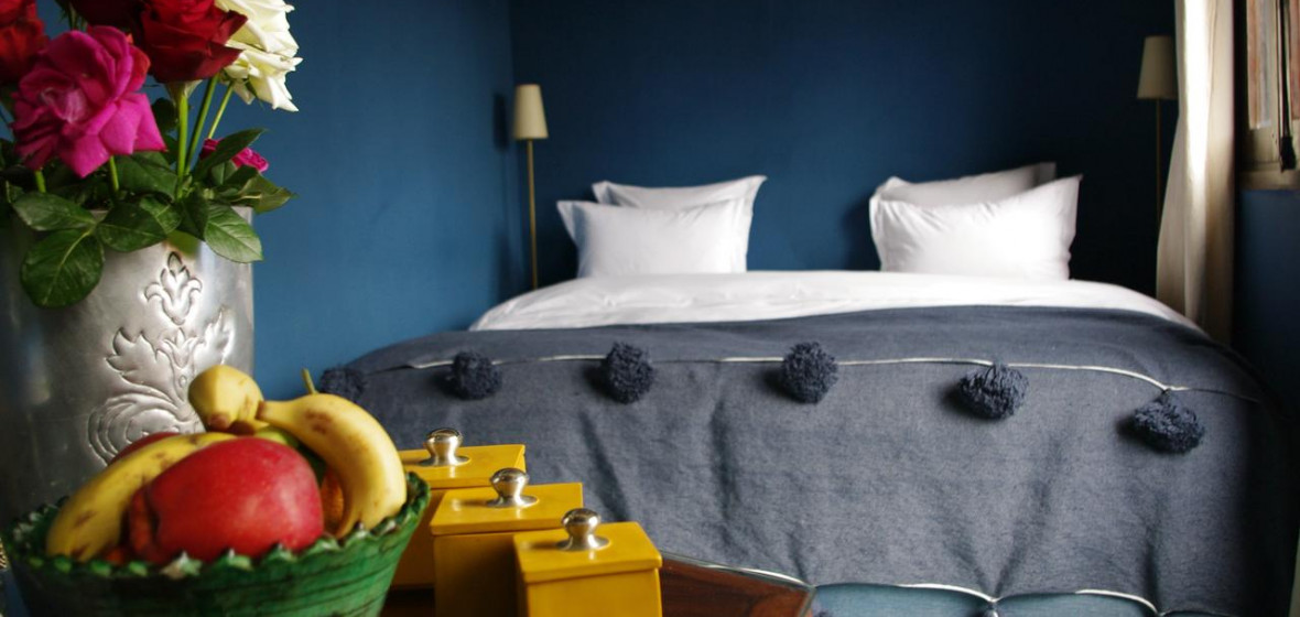Unlike some of Marrakech’s more formulaic, renovated riads, this one has an unusual layout with a wide stairway leading to rooms on different levels, one accessed via a quirky little metal bridge walkway. On the first floor there’s a small dipping pool with a sun deck above it and at the top of the property, a rooftop salon and terrace with traditional low cushioned seating.