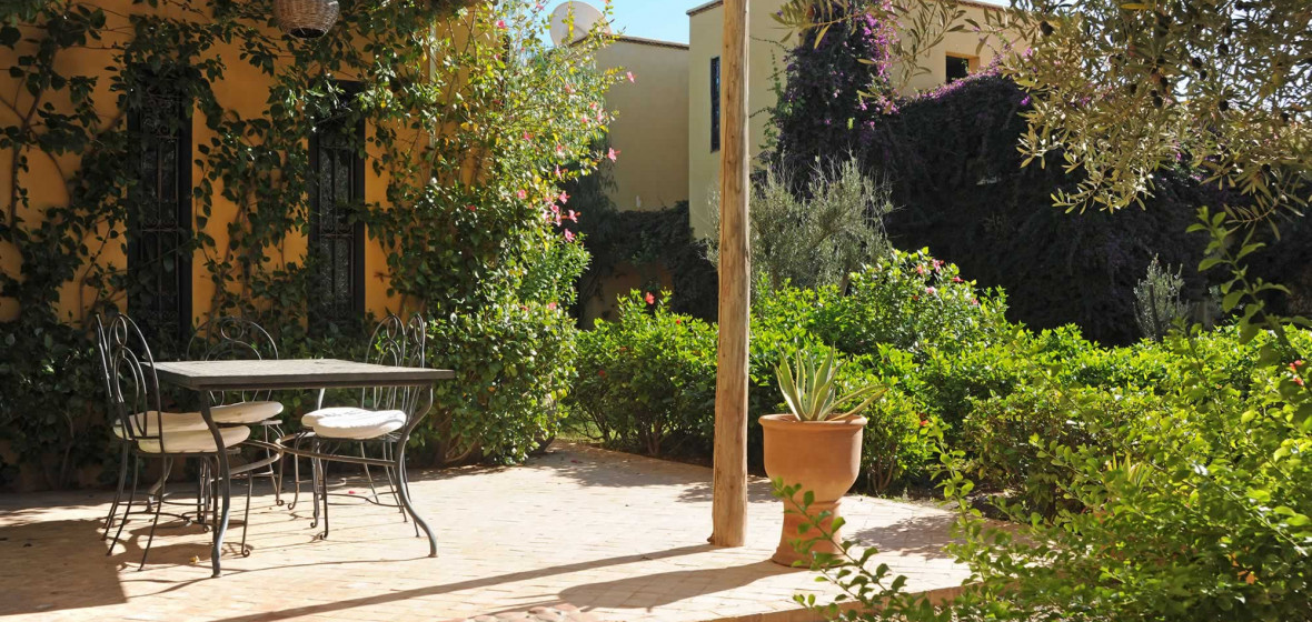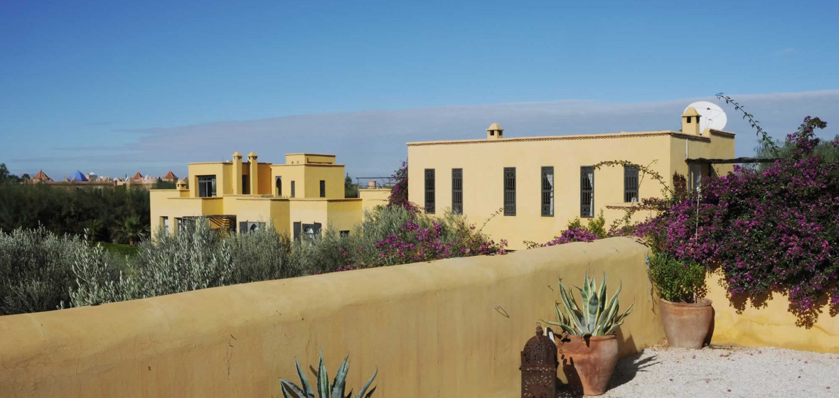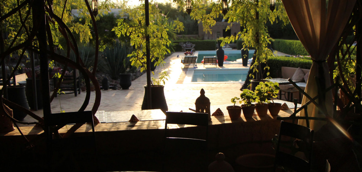 Dotted amongst pomegranate, lime and olive trees all beautifully underplanted with roses and geraniums are three well-designed villas with great outdoor space, each with a roof terrace and plunge pool. The Garden Suite creates a cool laid back base and the owners Francis and his wife, artist Dawn Boys-Stones have come up with a unique and fabulous build concept for their Berber styled Eco Suites complete with wet rooms using empty wine bottle bases set into window apertures for dappled window light. These eco huts have plenty of room inside and are built using recycled plastic bottles filled with sand, covered with Pise (local plaster made from earth & straw) and topped with a straw parasol shaped canopy supported by what was once, part of a telegraph pole. The overall resort layout works perfectly for a party venue or individual private family holidays. Children of all ages feel at home with the donkeys and dogs for additional company. The pools provide the perfect cooling off spot following the heat of the Marrakech Medina, especially as the bar is within stepping distance and is well-stocked complete with imaginative cocktails & fruit smoothies. Dine alfresco with a choice of delicious traditional Moroccan cuisine or Mediterranean fare. There is also an interior bar and lounging zone surrounded by open fires for those chillier winter evenings. Steps take you up to a roof terrace above with cosy cushioned corners made for Atlas mountain views. Siestas are the order of the day so numerous shady day beds, bean bags or open Berber style huts are popular. The vibe is Moroccan to the core.