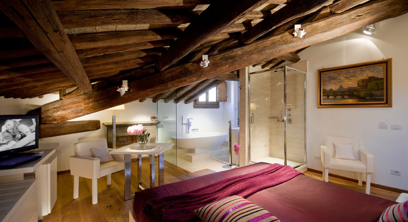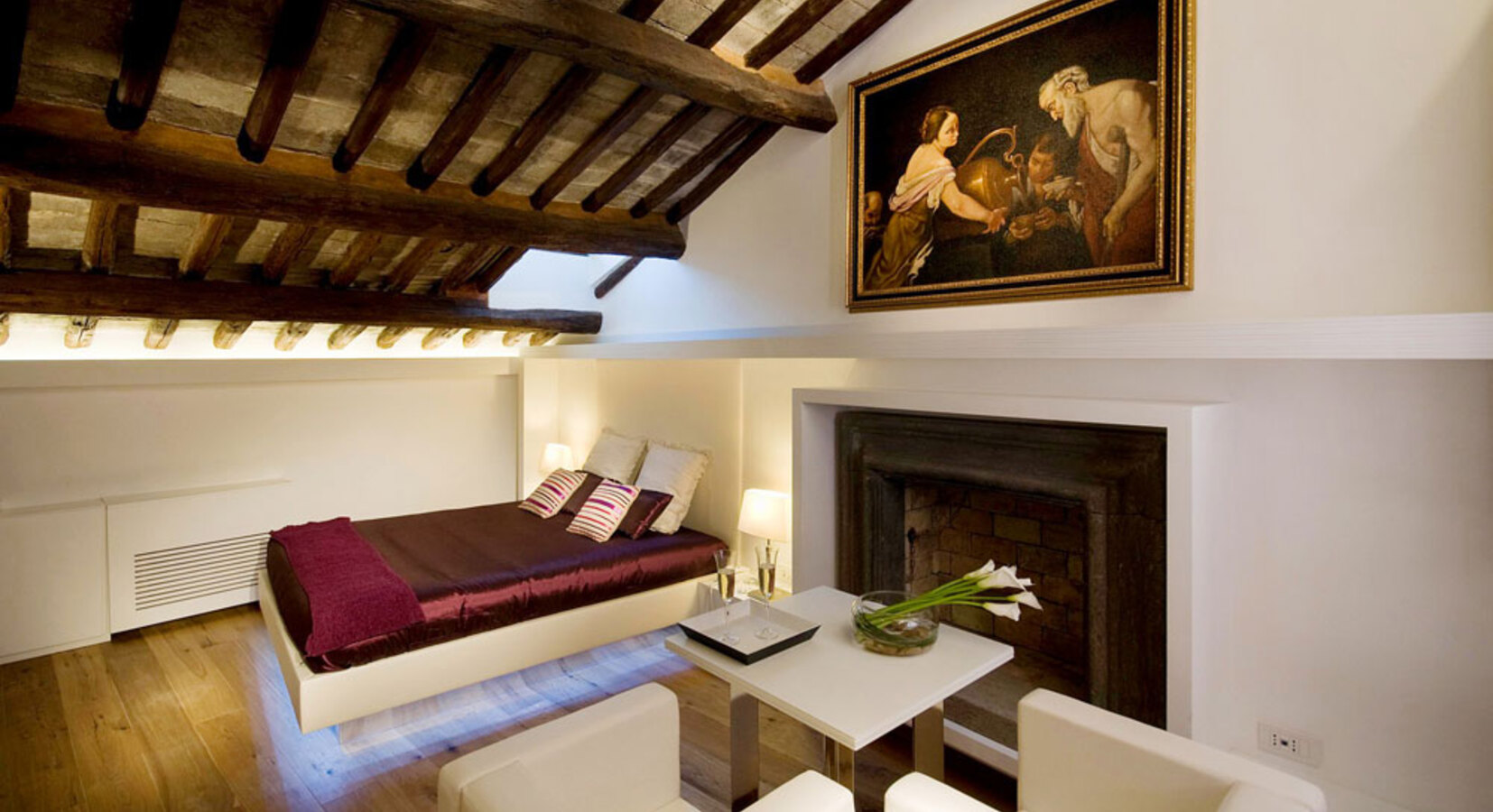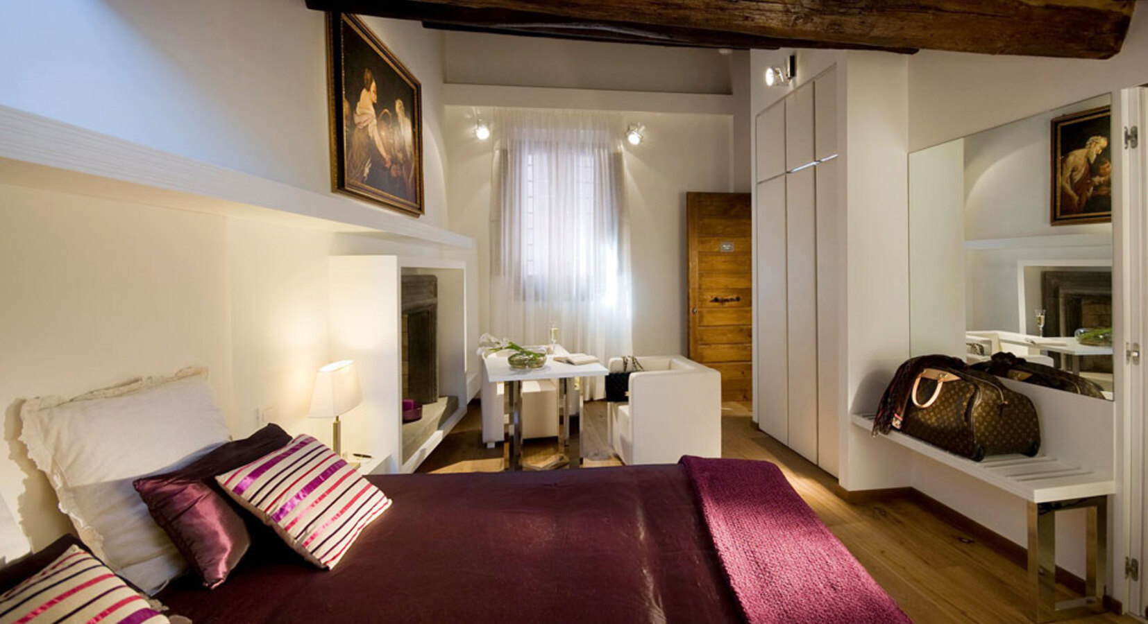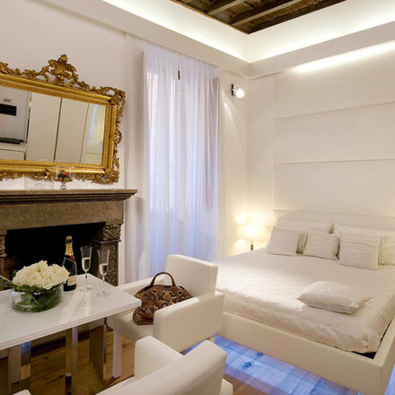 Staying in one of these suites is a bit like having your very own studio apartment in Rome, and a very stylish one at that. Of course this means you have to fend for yourself when it comes to dinners and entertainment, but isn't that a lot nicer anyway! The 6 suites set in an aristocratic home show off contemporary flair with white washed walls, glass bathrooms, and white leather furniture. On it's own this might feel clinical, but the contrast with the wooden beamed ceilings, parquet floors and oil paintings is rather lovely. A grown up spot for groups of friends or couples.