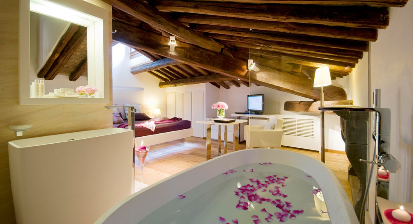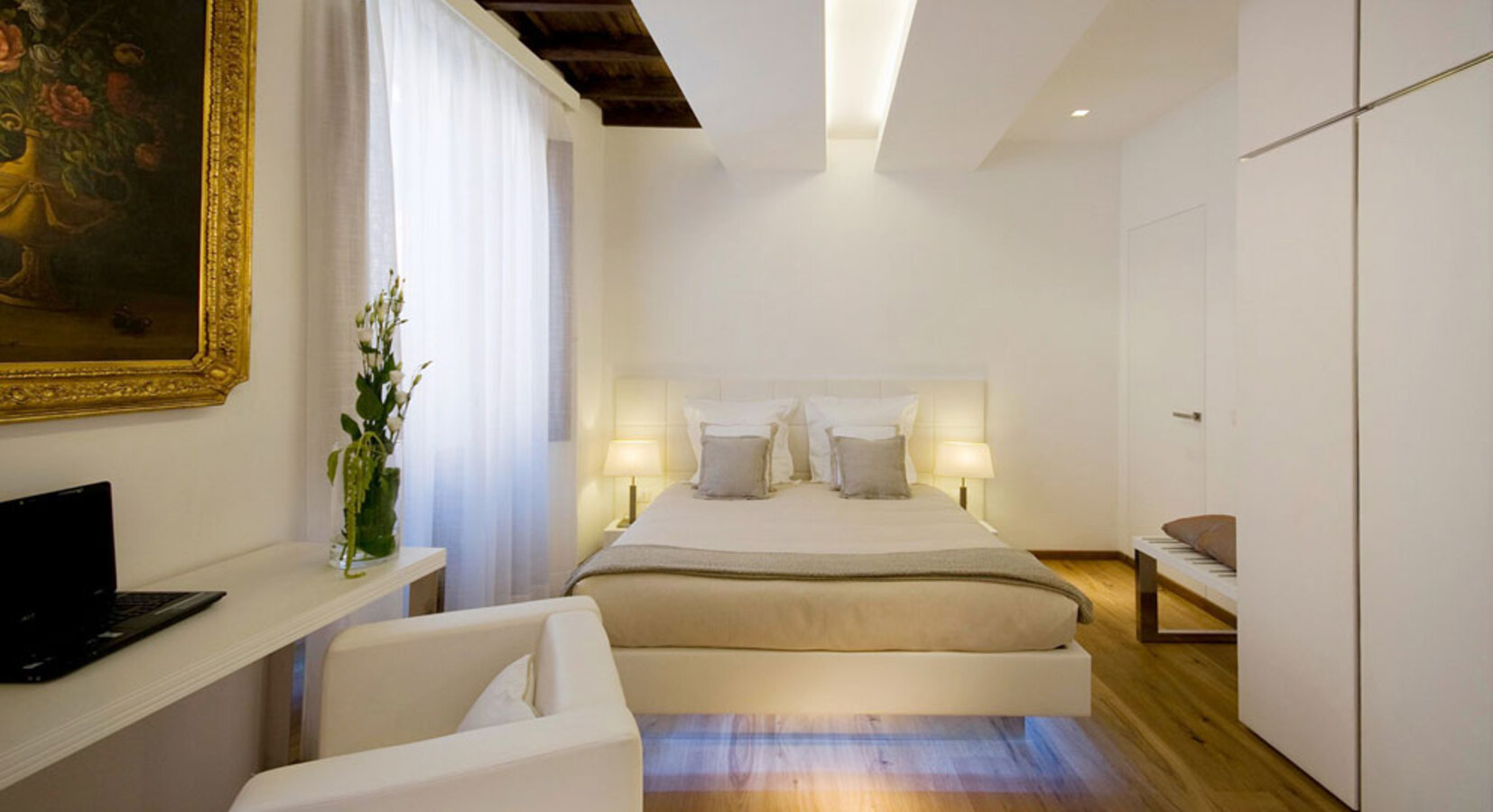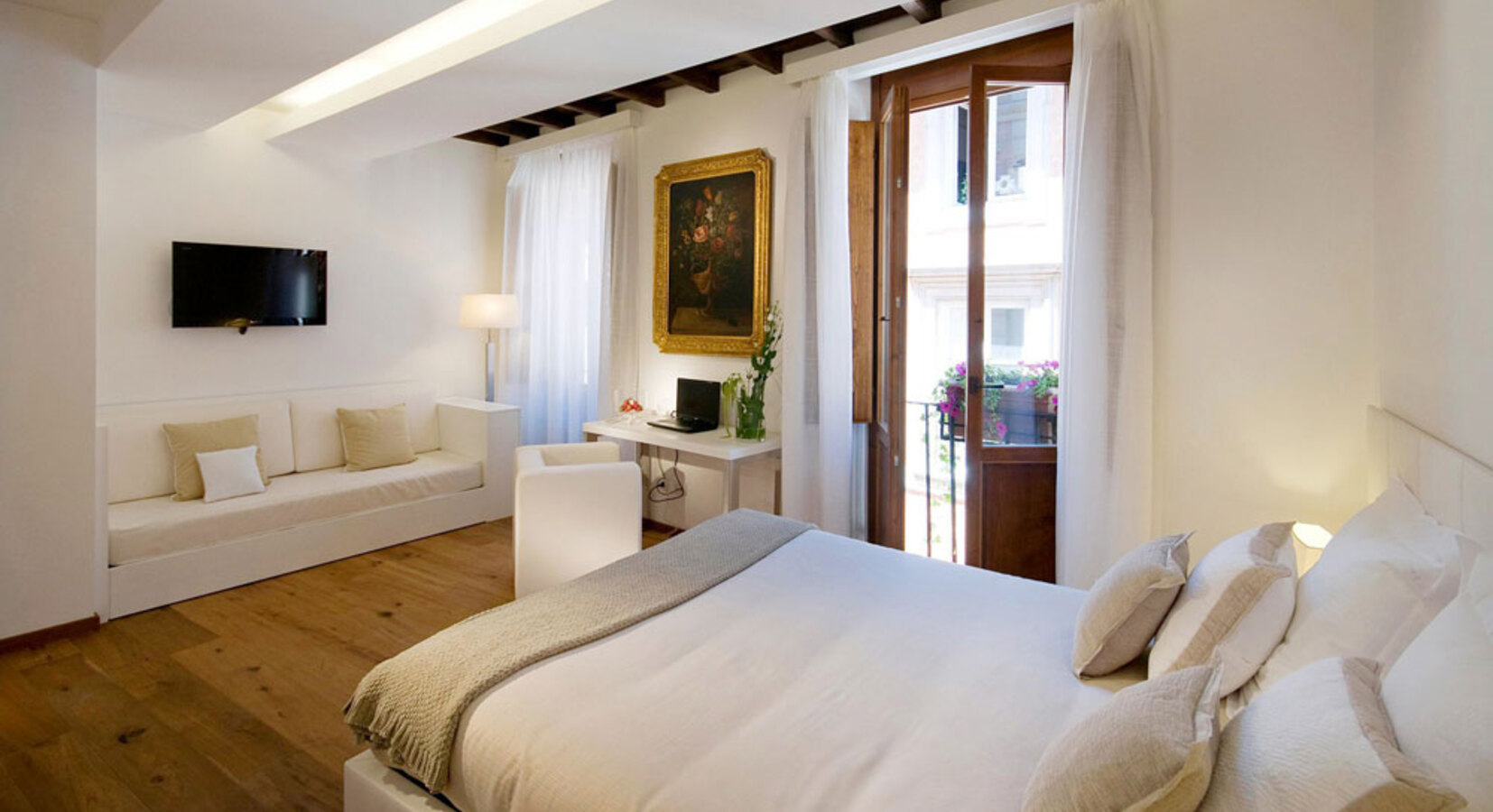 Staying in one of these suites is a bit like having your very own studio apartment in Rome, and a very stylish one at that. Of course this means you have to fend for yourself when it comes to dinners and entertainment, but isn't that a lot nicer anyway! The 6 suites set in an aristocratic home show off contemporary flair with white washed walls, glass bathrooms, and white leather furniture. On it's own this might feel clinical, but the contrast with the wooden beamed ceilings, parquet floors and oil paintings is rather lovely. A grown up spot for groups of friends or couples.