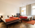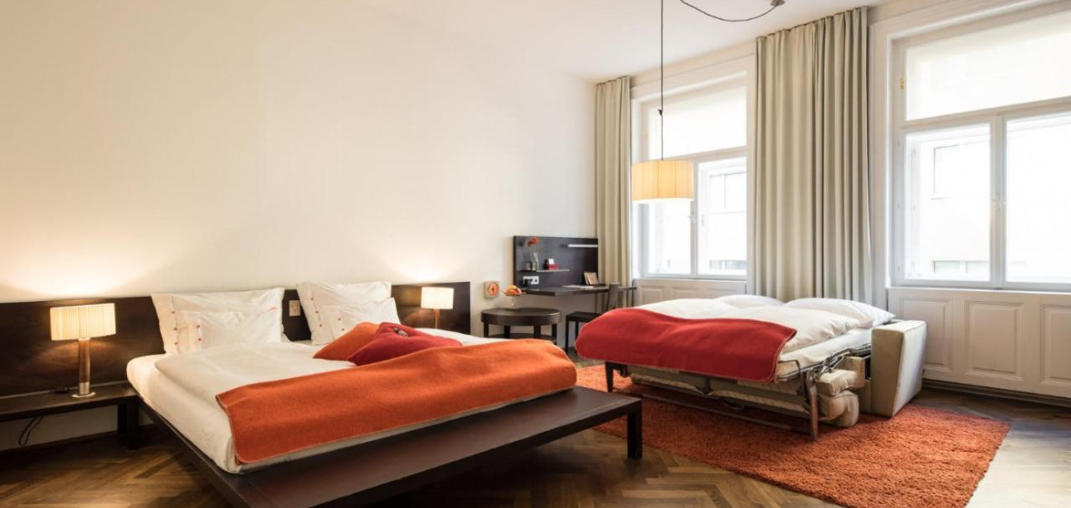 With barely a sign to announce it, this hotel is difficult to find. But persevere, it’s worth it. A youthful contemporary conversion of a 19th-century first-floor apartment, it has an attractive sitting room, with bookcases, sofas, standard lamps and an ultra-modern fireplace. It is painted white throughout, with splashes of orange and brown leather furniture. The twenty-five light, wood-floored bedrooms have ‘open’ bathrooms, usually hidden behind the bed.