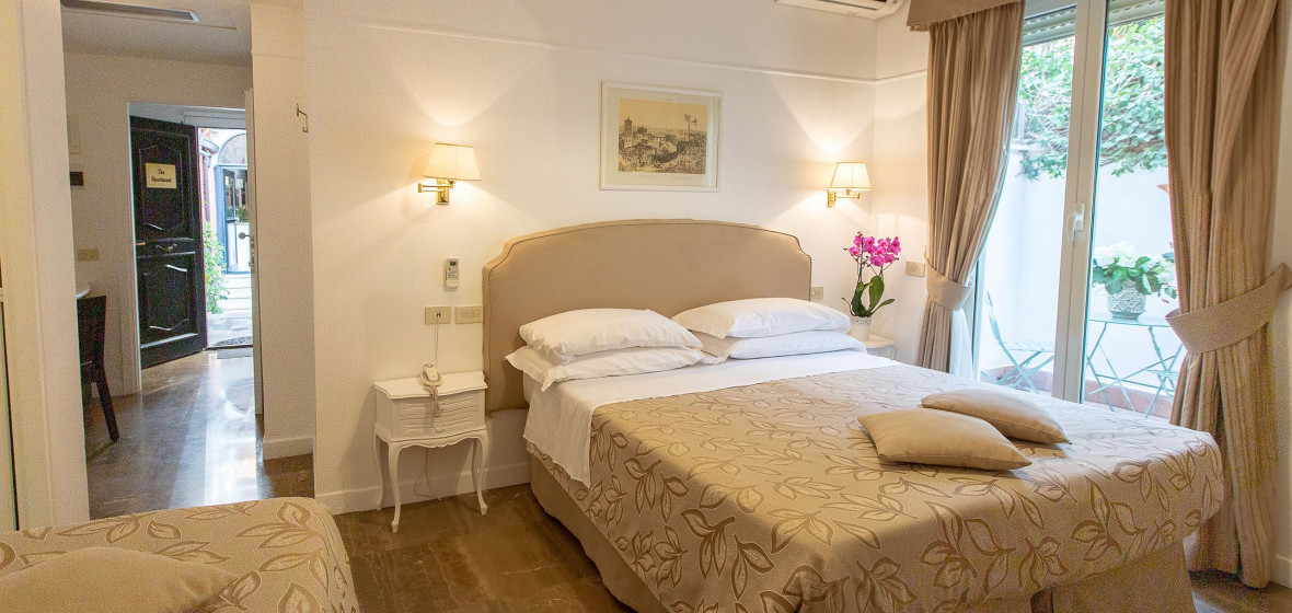 Quels sont les types de chambres les plus populaires, et pourquoi ? Les chambres les plus populaires sont : la chambre double standard avec balcon pour les couples (c'est une petite chambre romantique à cause du balcon), les chambres supérieures (chambres élégantes et spacieuses au dernier étage avec petites terrasses et vue), l'appartement jardin qui est idéal pour les familles car il est composé de deux chambres séparées mais adjacentes avec deux salles de bains, un patio commun et un patio privé par chambre.