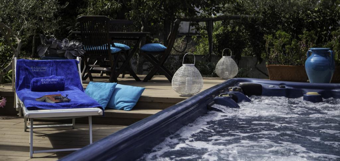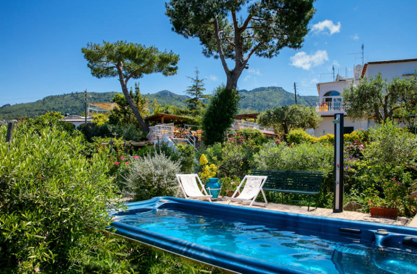 Es gibt ein kleines Tauchbecken im GartenKein Restaurant