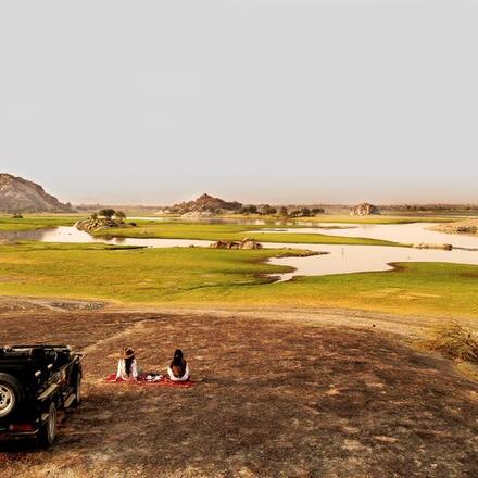 At last a property has arrived to provide a luxurious place to rest ones head in this spectacular corner of Rajasthan that doesn't come at the eye watering prices of nearby Sujan's camp. It's a mystery that this area is somewhat unexplored. Craggy rocks, swathes of grassland, interlaced with stretches of desert, and an enormous lake all make for the perfect backdrop for an escape to nature. Beyond this the area is teaming with leopards which unlike their jungle brethren are relatively easy to spot as they laze on the rocky outcrops. The lake is inhabited by no less than 400 crocodiles, flamingoes stand gracefully in the shallows and sloth bears can be spotted if you get very lucky. Despite being a new build the hotel itself blends perfectly into its surrounds. The twelve rooms are spacious beyond necessity and have been simply decorated with white hues, flamingo dotted curtains and sturdy teak furniture. A rain shower is a welcome addition and the terraces complete with rattan chairs are where one can while away hours. Jeep safaris are included in the price and set out at dawn and dusk along with a local naturalist. On-site there's a fabulous infinity pool and bikes that can be used to explore the area. Evenings are spent sipping a tipple around a campfire before hearty meals of local cuisine are served in the restaurant. A nature lovers paradise.