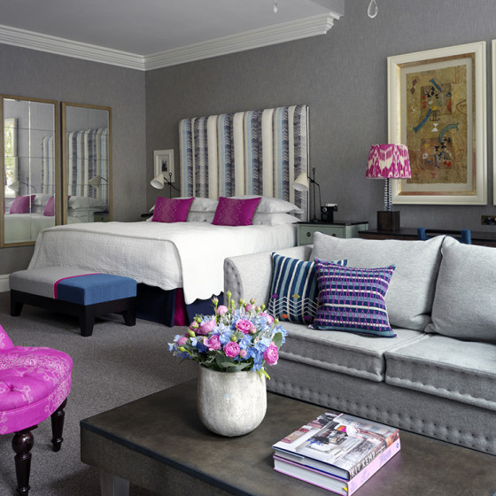 A stone’s throw from Harrods, Knightsbridge Hotel – part of Firmdale Hotels – couldn’t be better placed for hitting the shops. Bedrooms are spread across six floors and range from small single rooms and doubles to spacious deluxe rooms and suites, all furnished in bold fabrics and designs, as is Kit Kemp’s signature style. Bright and colourful in décor – with extremely comfortable seating – the Drawing Room and Library offer guests a relaxing place to sit and enjoy breakfast, afternoon tea or drinks from the honesty bar. There’s also 24-hour room service for in-room dining. Children are treated to milk and cookies at bedtime and there’s a children’s menu, plus the option of interconnecting rooms.