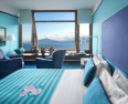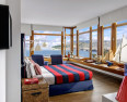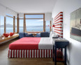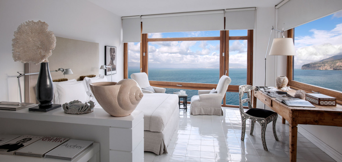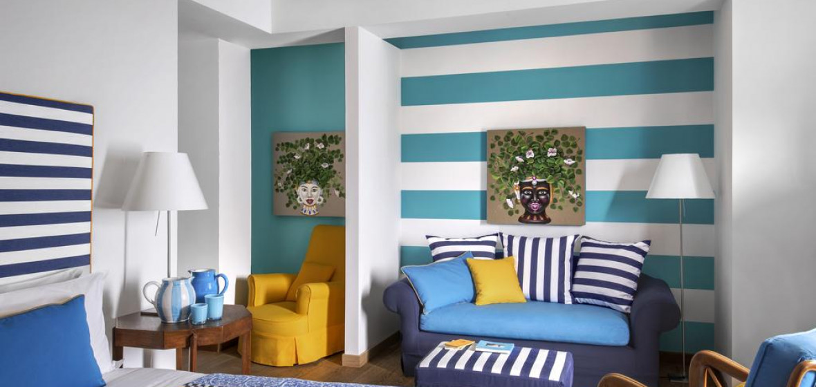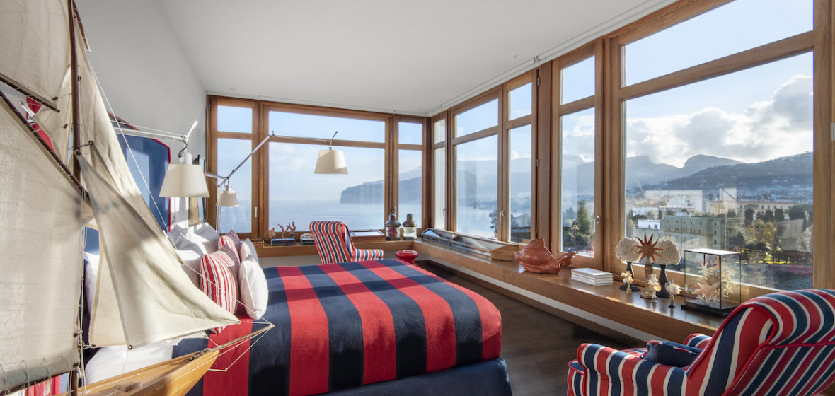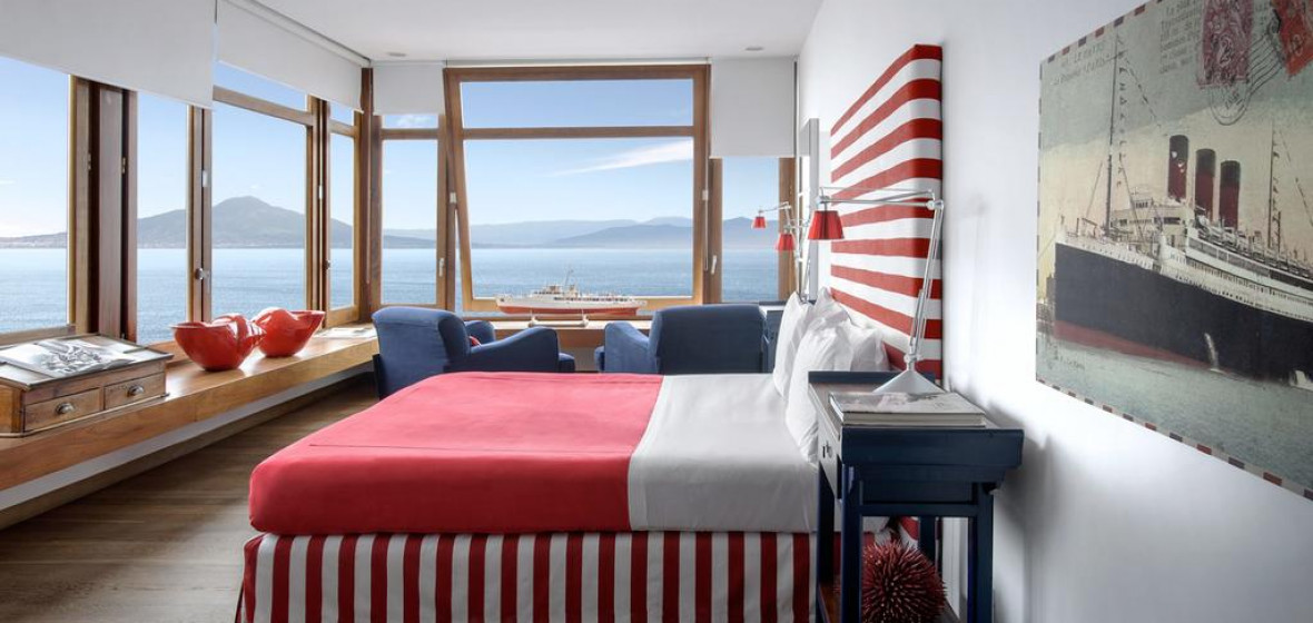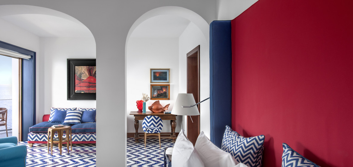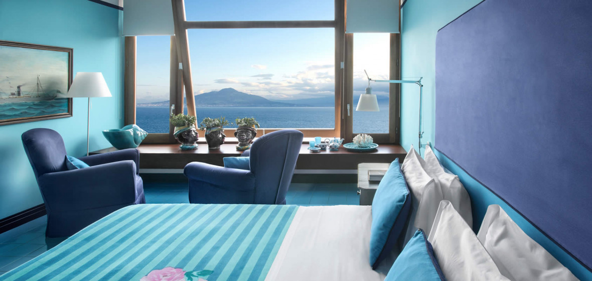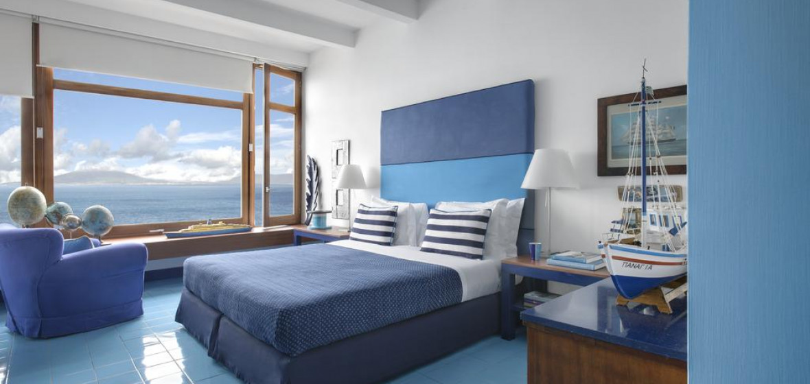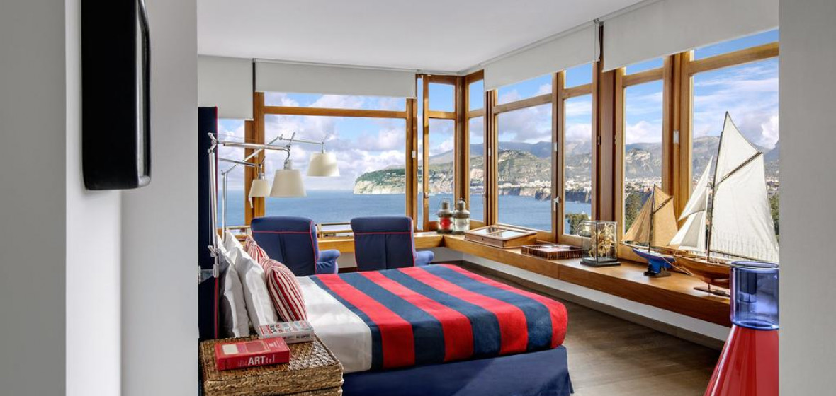 Rendered in a refreshing, Pop Art palette of reds, whites and blues, this small clifftop hotel has been carefully curated by its interior designer owner. Guests will feel like they’ve stepped into a painting – perhaps one of David Hockney’s swimming pools – and the walls of its social spaces are peppered with intriguing objet. Each bedroom is unique – yours might feature wall-to-wall tiling, a reading nook, or a model ship – and all go big on sea views, with gigantic picture windows and small balconies. Though there’s no restaurant, the buffet breakfast here is a cut above the usual spread. Friendly young staff serve a cornucopia of southern Italy’s finest produce on the spacious terrace – also home to a scenically-set whirlpool bath.