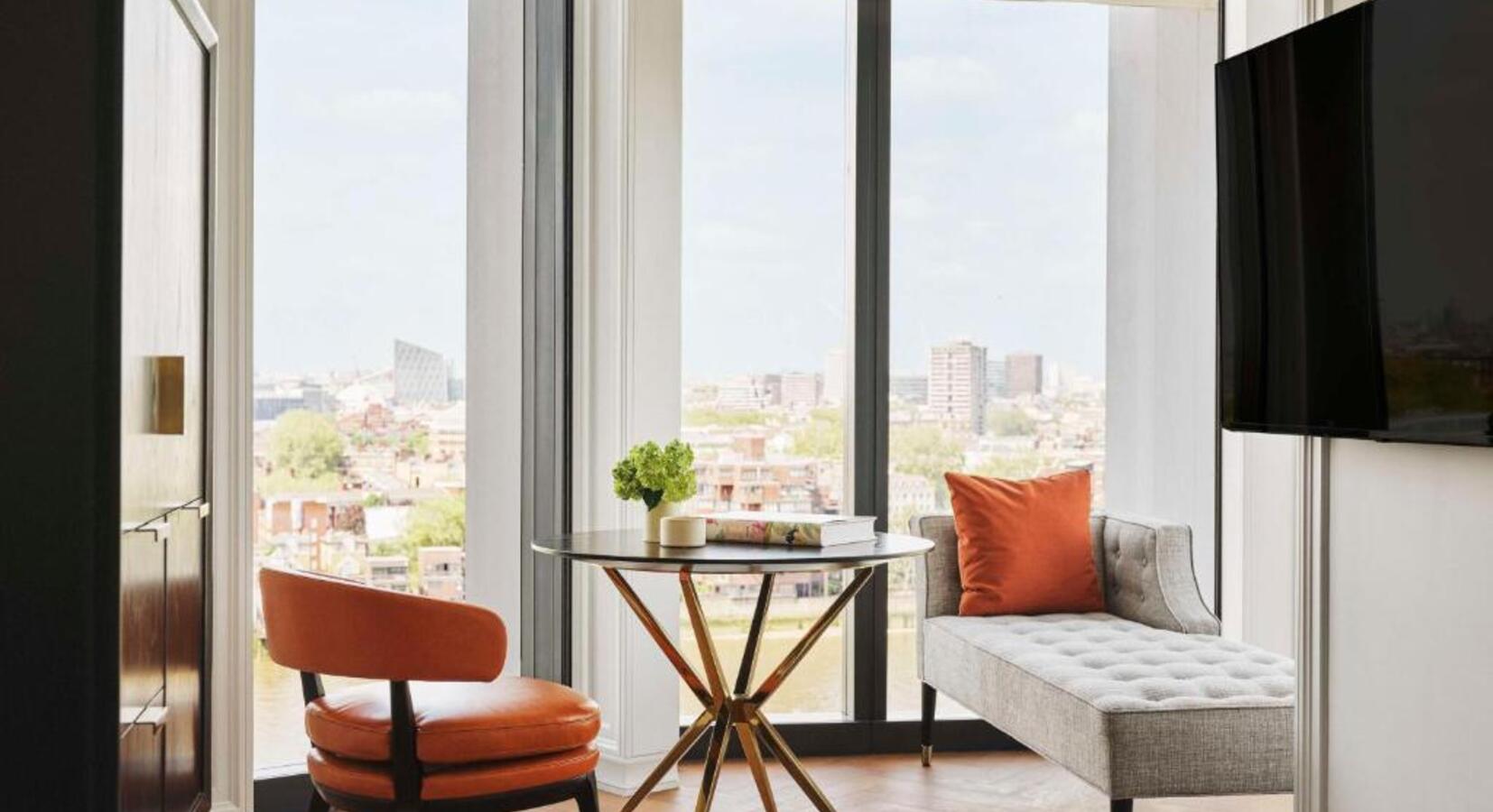 Die 203 Zimmer und Suiten sind perfekt in ihrer Frische und Ausstattung. Sie bieten spektakuläre Ausblicke auf den Fluss. Die Neutralität wird durch orangefarbene Ledersitze und William-Morris-Bildschirme ausgeglichen. Es gibt Plüschbettwäsche, ein beheiztes Toto-Klo, eine Regendusche und eine freistehende Badewanne mit Klauenfüßen.