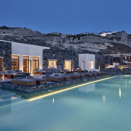 “A suave all-suites resort, perched above Ammoudi Bay in Oia. Chic interiors blend Cycladic simplicity with earthy textures, inviting serenity and style. Featuring exquisite dining, a wine cellar, and a wellness oasis, it’s a haven for the senses. All you need for a luxurious getaway in Santorini. ”