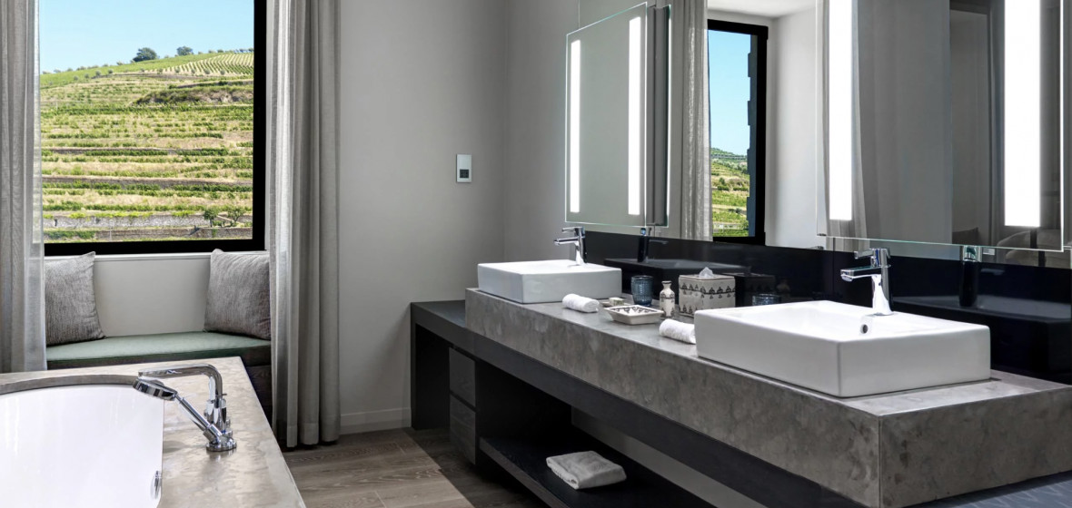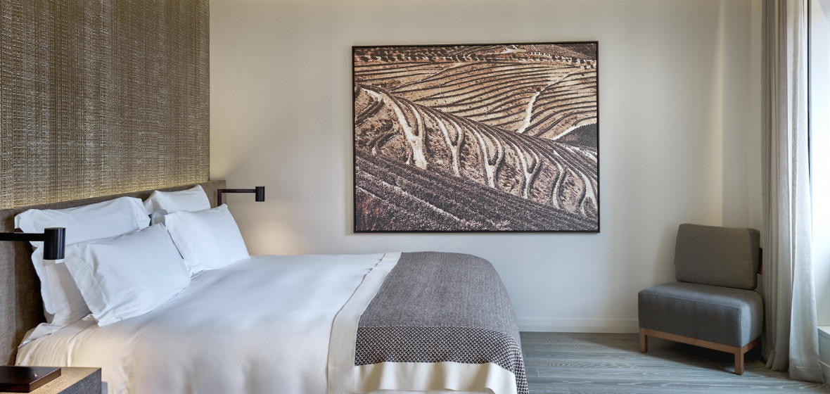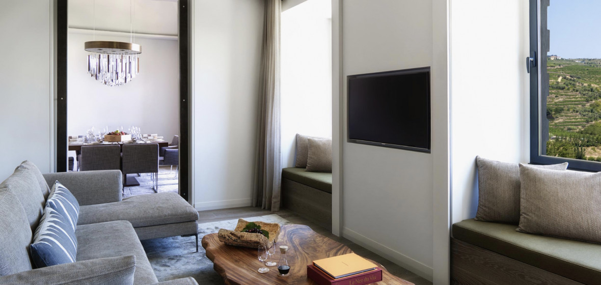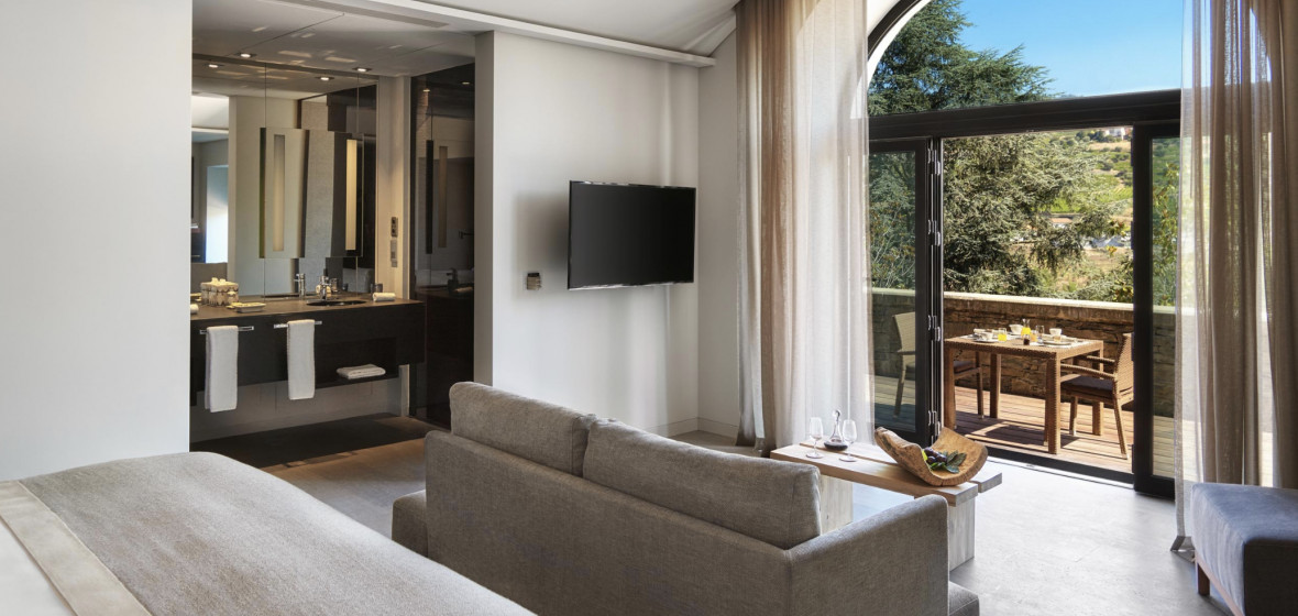 Rooms bring a new level of luxury to this part of Portugal, particularly the latest vineyard and rooftop suites which open out onto large private gardens or terraces with hot tubs. Décor is similar to the other rooms which also feature Portuguese oak floors, muted colours and textured walls. Technology exists in the shape of an in-room tablet which operates the lighting, curtains and television as well as any in-room dining you might want.