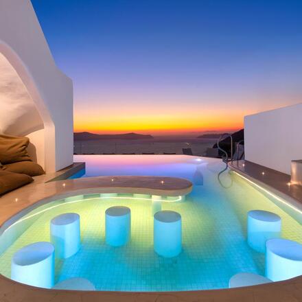 Der größte Infinity-Pool mit Panoramablick in Fira und zwei der Suiten verfügen über private TauchbeckenBeschränkungen für Kinder